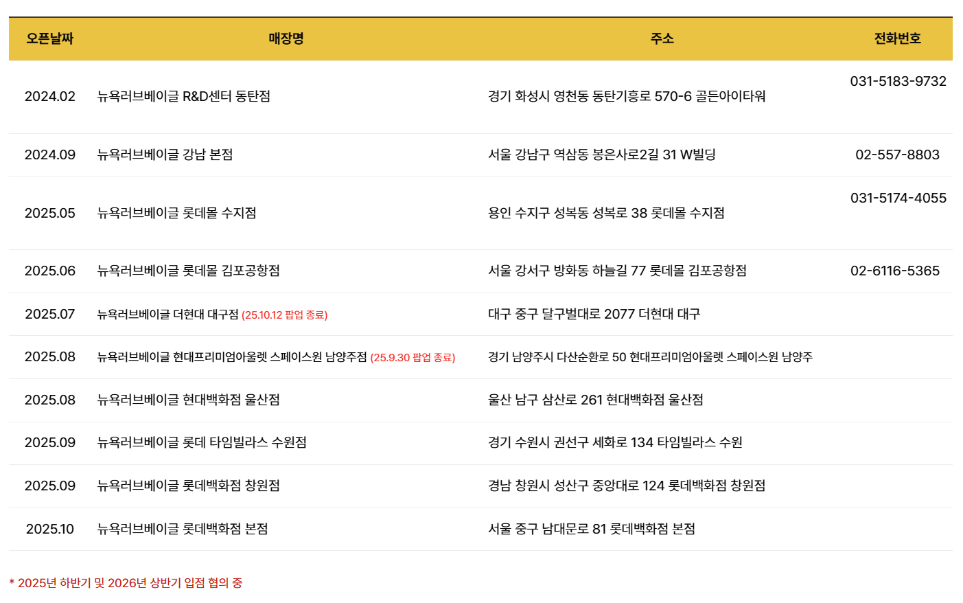 | 2025.10 | 뉴욕러브베이글 롯데백화점 본점 (25.11.09 팝업 종료) | 서울 중구 남대문로 81 롯데백화점 본점 |